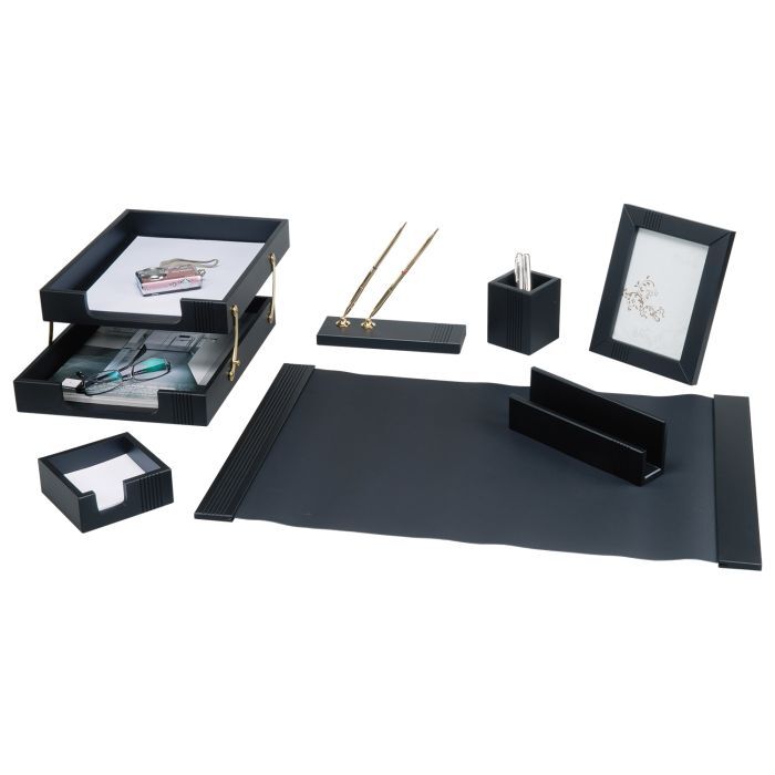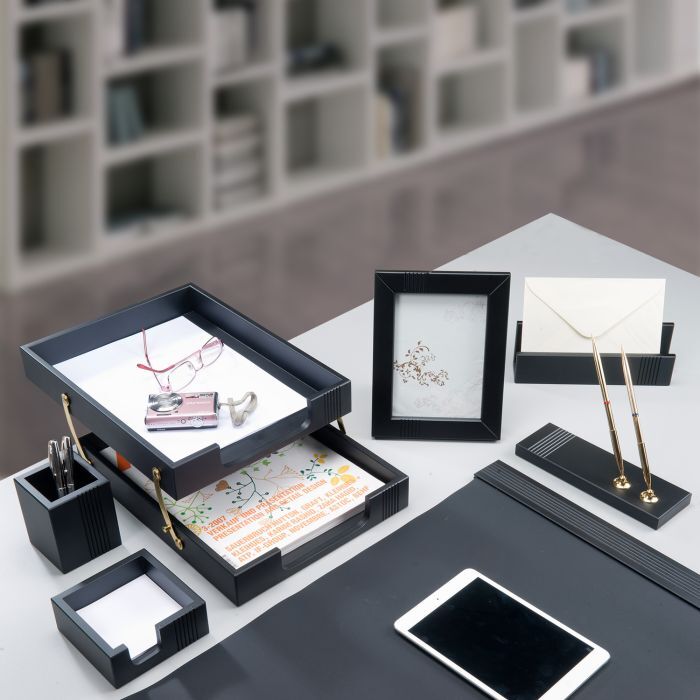 Настольный набор премиум-класса из дерева черного цвета с золотистой фурнитурой состоит из 7 предметов и содержит самое необходимое для организации комфортного и элегантного рабочего места. В наборе: двойной лоток для бумаг; коврик для письма (размер - 64,5х42,5 см); подставка для ручек (2 шариковые ручки в комплекте); стакан-подставка для письменных принадлежностей; подставка для бумажного блока; подставка для писем; фоторамка. На нашем сайте вы можете заказать: Набор настольный BESTAR "Osiris" деревянный, из 7 предметов, цвет чёрное дерево.